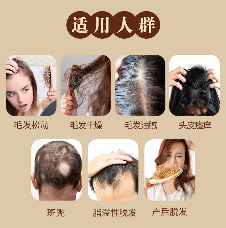 【功能主治】養血祛風,益腎填精。用于血虛風盛、腎精不足所致的脫發,癥見毛發松動或呈稀疏狀脫落、毛發干燥或膩、頭皮瘙癢;斑禿、全禿、脂溢性脫發與病后、產后脫發見上述證侯者。
