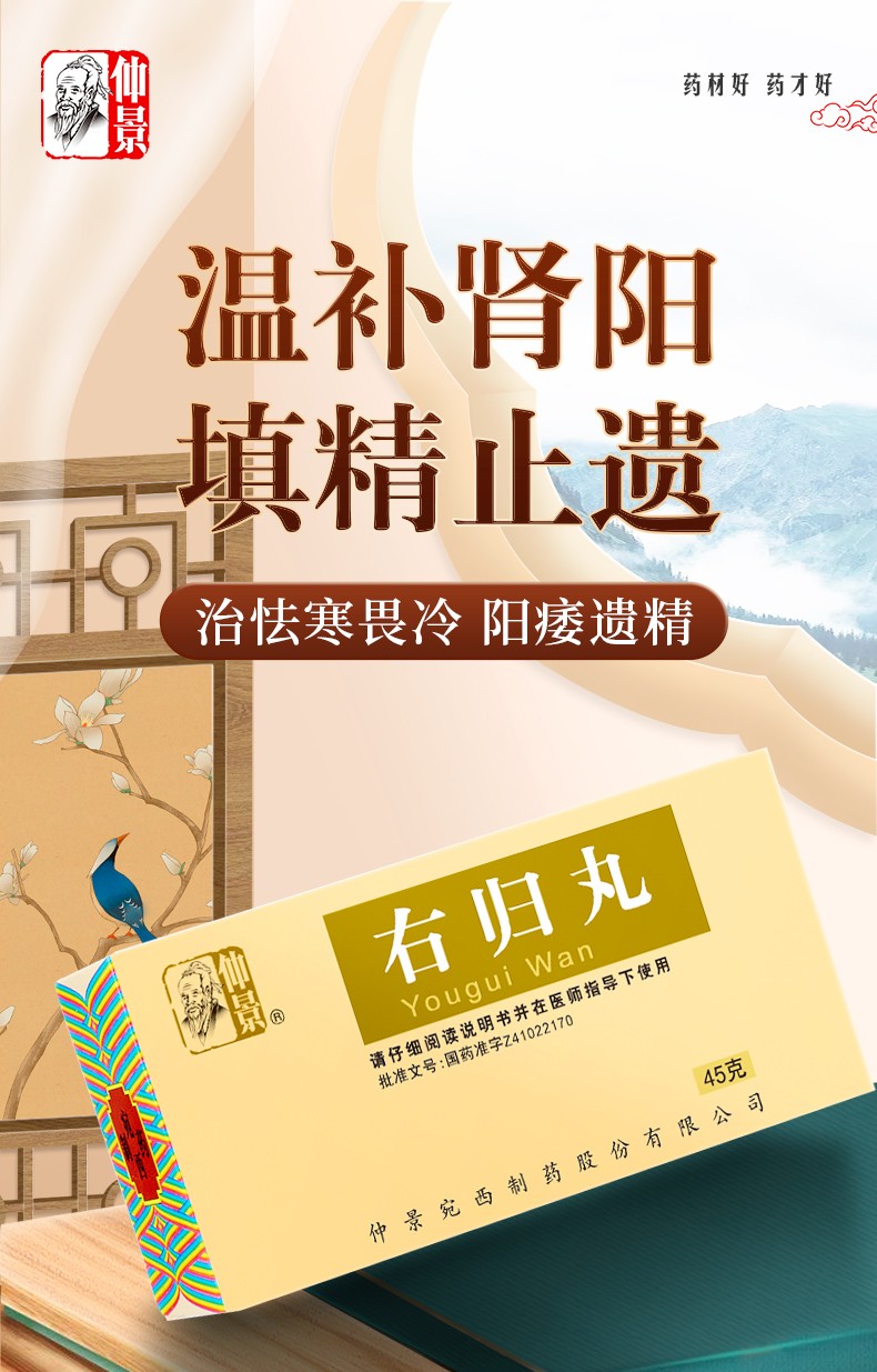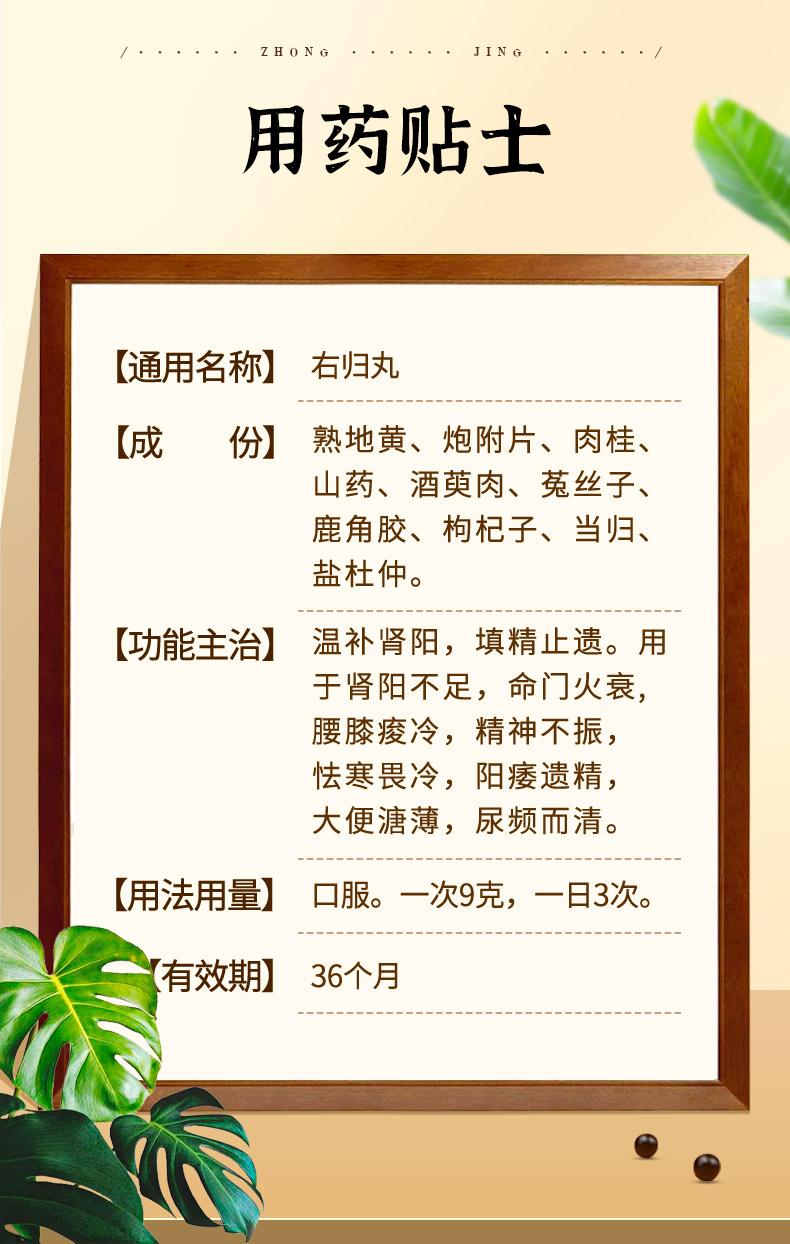 右歸丸主治:溫補腎陽,填精止遺。用于腎陽不足,命門火衰,腰膝痠冷,精神不振,怯寒畏冷,陽痿遺精,大便溏薄,尿頻而清